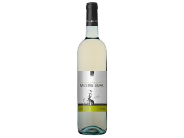 Garrafa de vinho branco Mestre Silva com rótulo prateado e faixa amarela