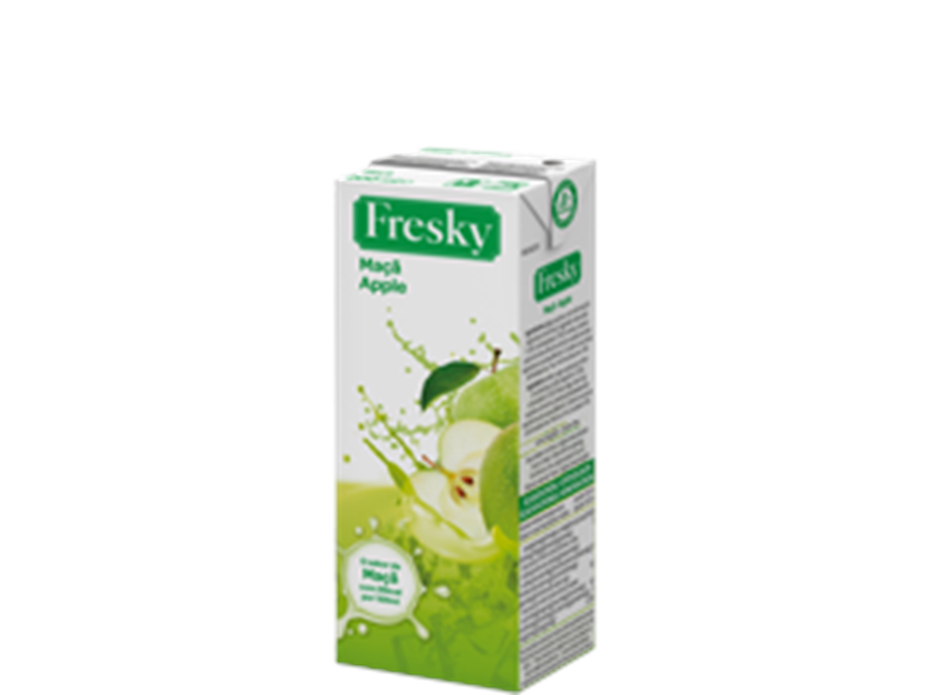 Embalagem de sumo de maçã Itesky tetrapak branco e verde com imagens de maçãs