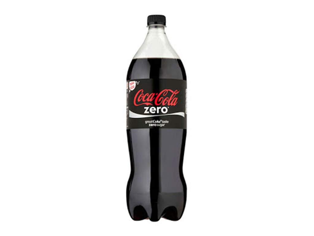 Garrafa de Coca-Cola Zero preta de 2 litros com rótulo preto e vermelho