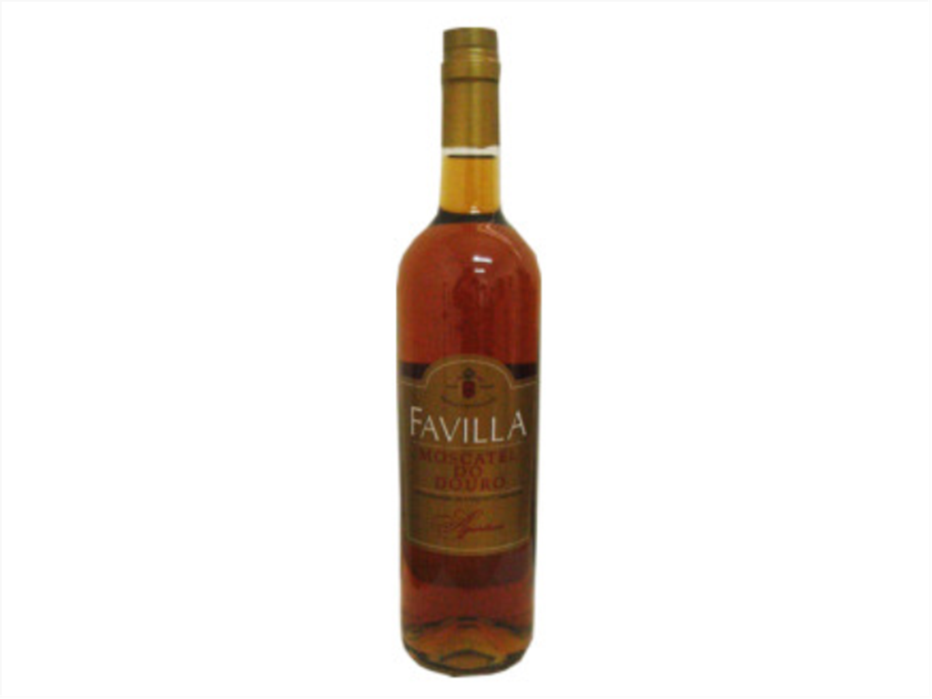 Garrafa de bebida alcoólica Favilla Moscatel Douro com rótulo dourado e preto