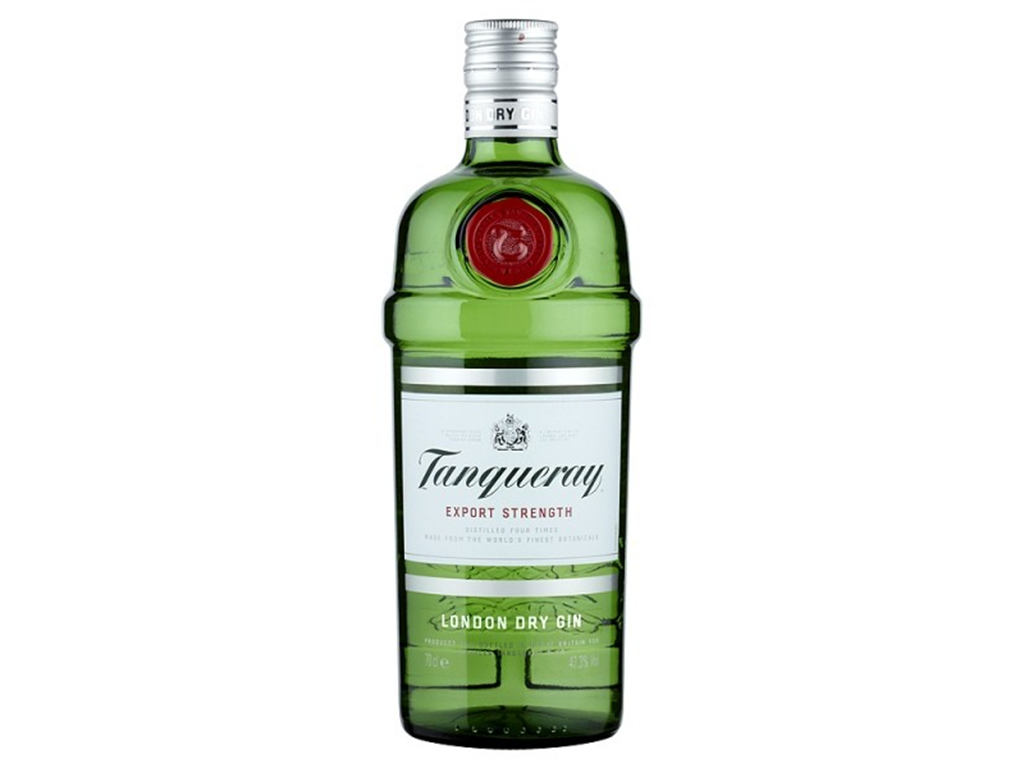 Garrafa verde de gin Tanqueray com rótulo branco e vermelho
