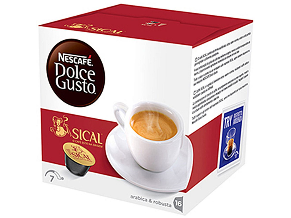 Embalagem de cápsulas de café Nescafé Dolce Gusto Sical, branca e vermelha, com uma chávena de café com espuma e uma cápsula amarela visíveis