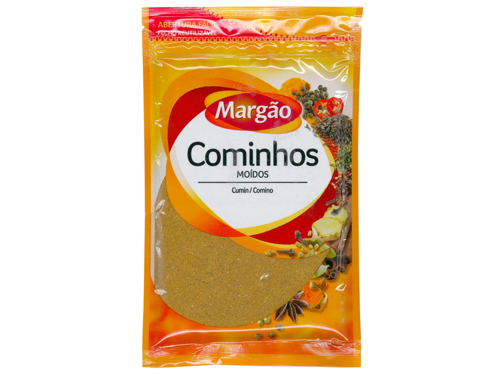 Pacote de cominhos moídos Margão com embalagem plástica amarela e transparente