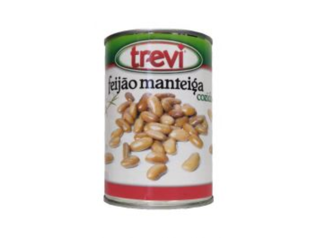 Lata de feijão manteiga cozido Trevi com imagem do produto na embalagem