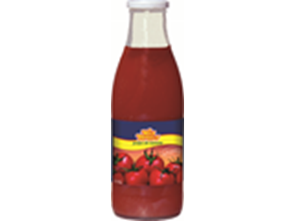Garrafa de vidro com sumo de tomate e rótulo colorido