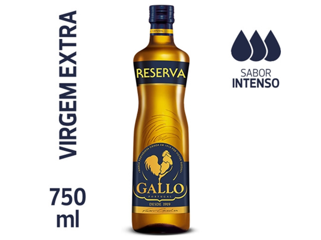 Garrafa de azeite Gallo Reserva 750 ml com rótulo azul e amarelo