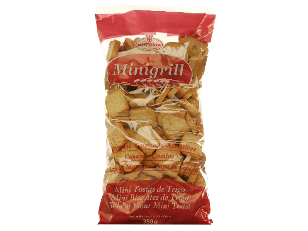 Pacote de tostas Mini Grill em plástico transparente e vermelho com texto e tostas visíveis