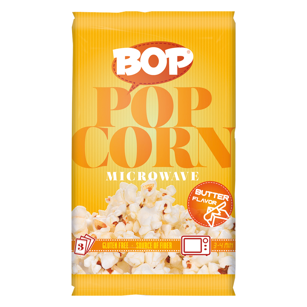 Pacote amarelo de pipocas de micro-ondas sabor manteiga BOP