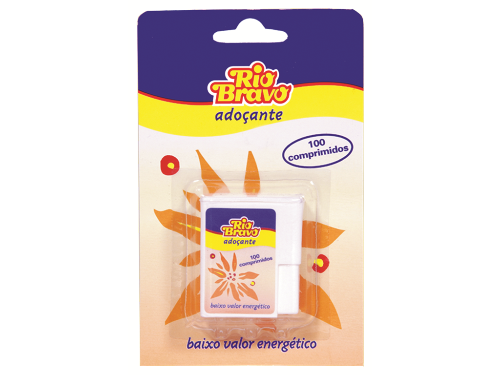 Embalagem de adoçante Rio Bravo com 100 comprimidos e design colorido