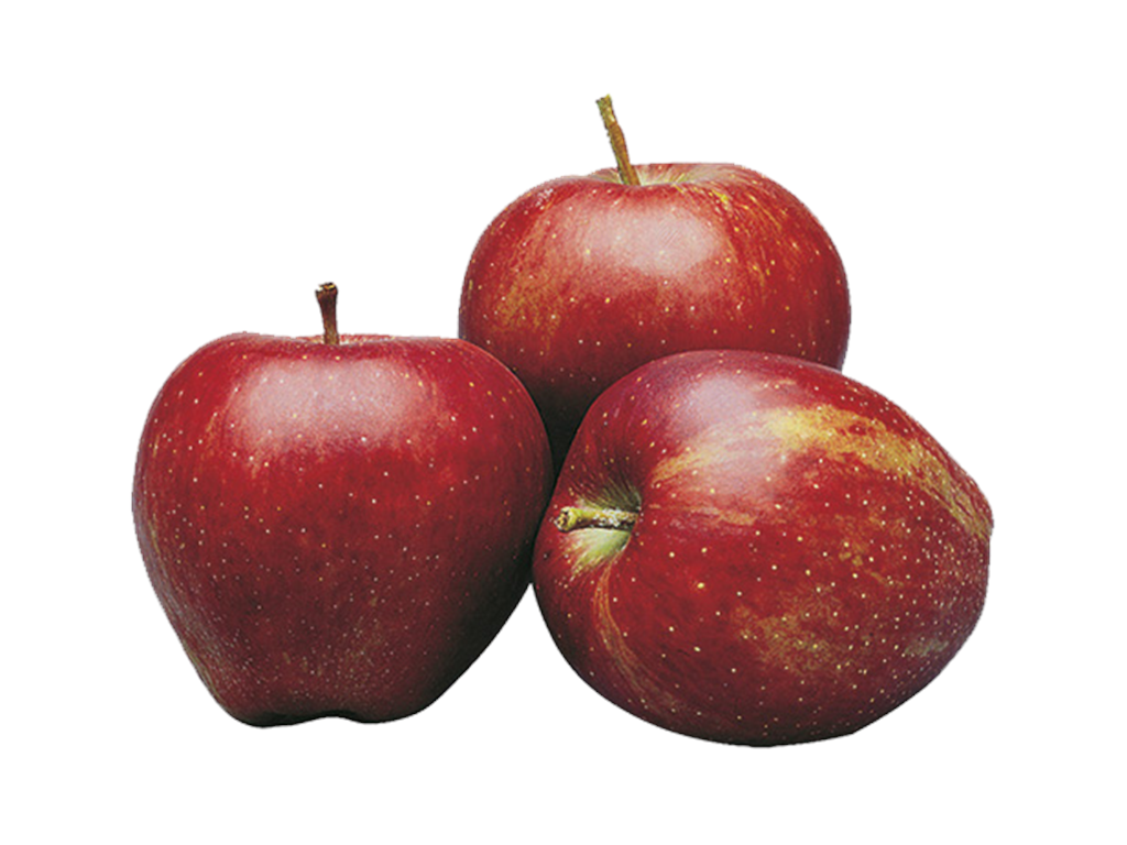Três maçãs vermelhas com manchas amarelas sobre fundo branco