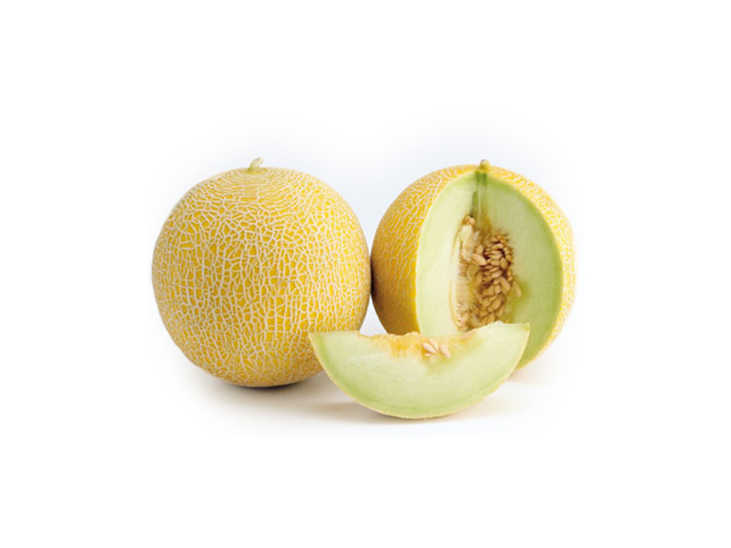 Dois melões amarelos, um cortado, com polpa verde clara e sementes visíveis