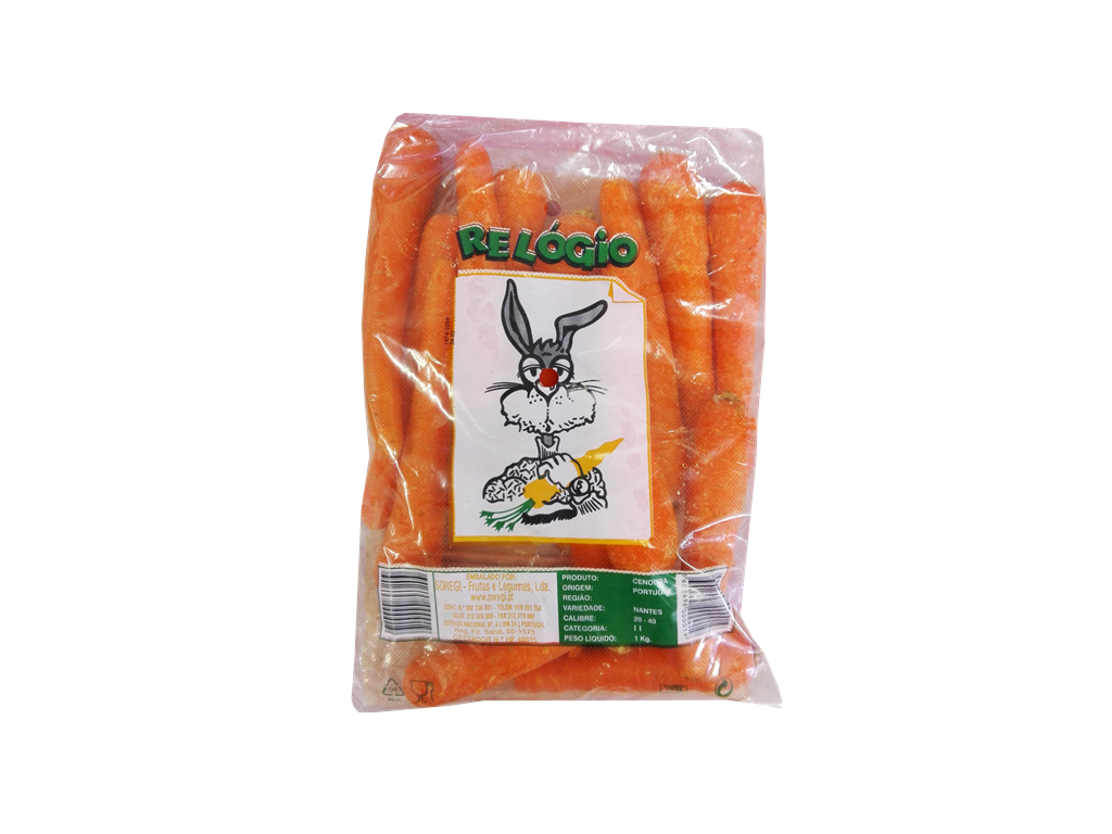 Pacote de cenouras frescas embaladas em plástico com etiqueta de coelho e texto RE-LÓGIO