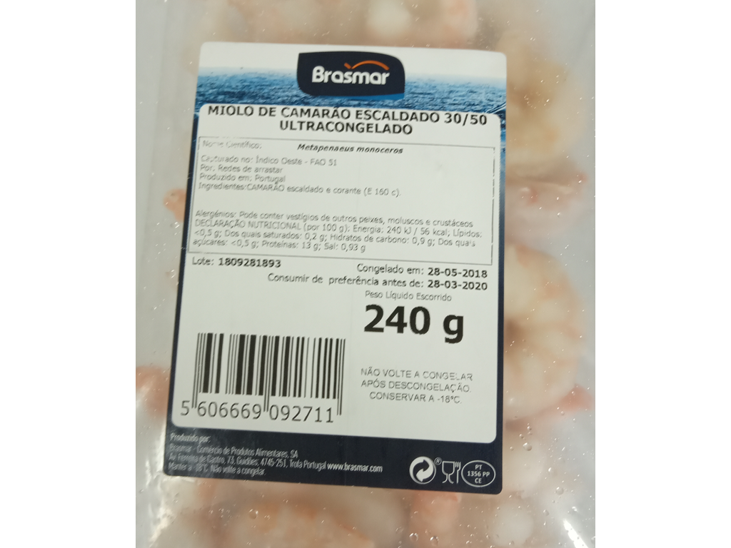 Embalação de Miolo de Camarão Escaldado Brasmar Ultracongelado 240g