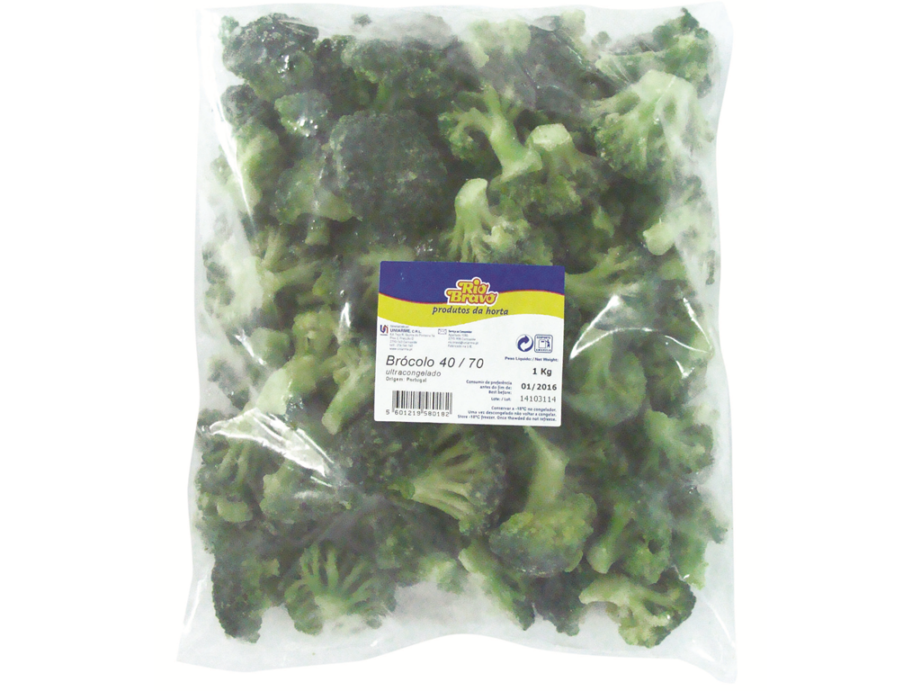 Pacote plástico de brócolos congelados com etiqueta azul, amarela e branca