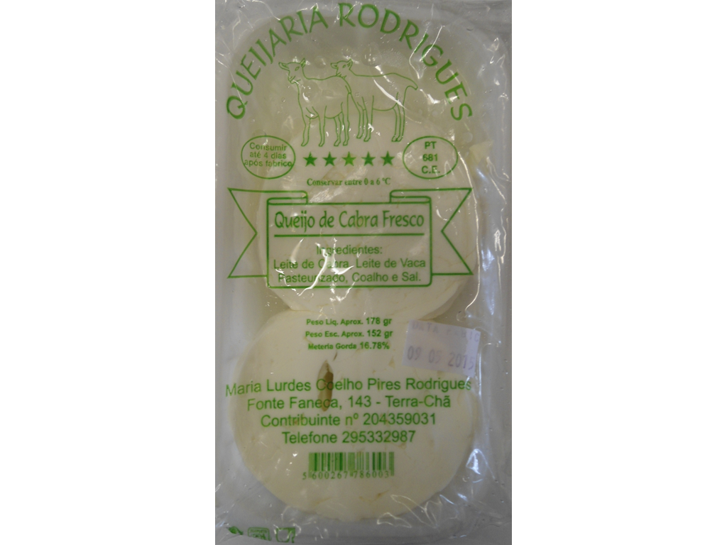 Queijo de cabra fresco em embalagem transparente com texto verde da Queijaria Rodrigues