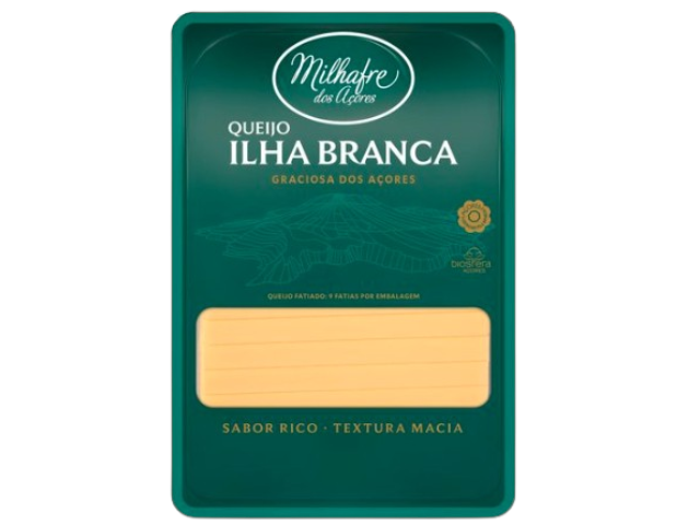 Embalagem de queijo fatiado Ilha Branca Milhafre dos Açores com janela transparente