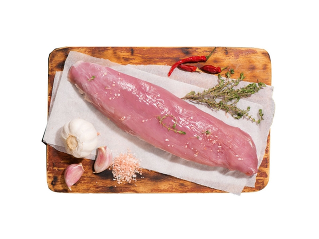 Lombo de porco cru numa tábua de madeira com alho, sal grosso, tomilho e malaguetas