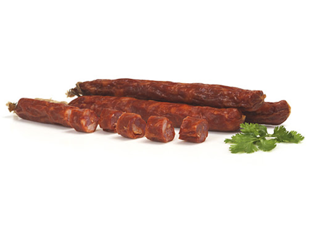 Enchidos castanho-avermelhados inteiros e fatiados com coentros verdes sobre fundo branco