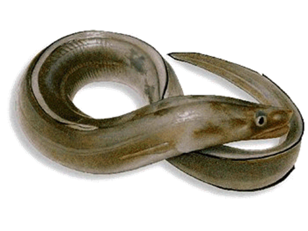 Enguia castanho-esverdeada com pele lisa e brilhante em fundo branco