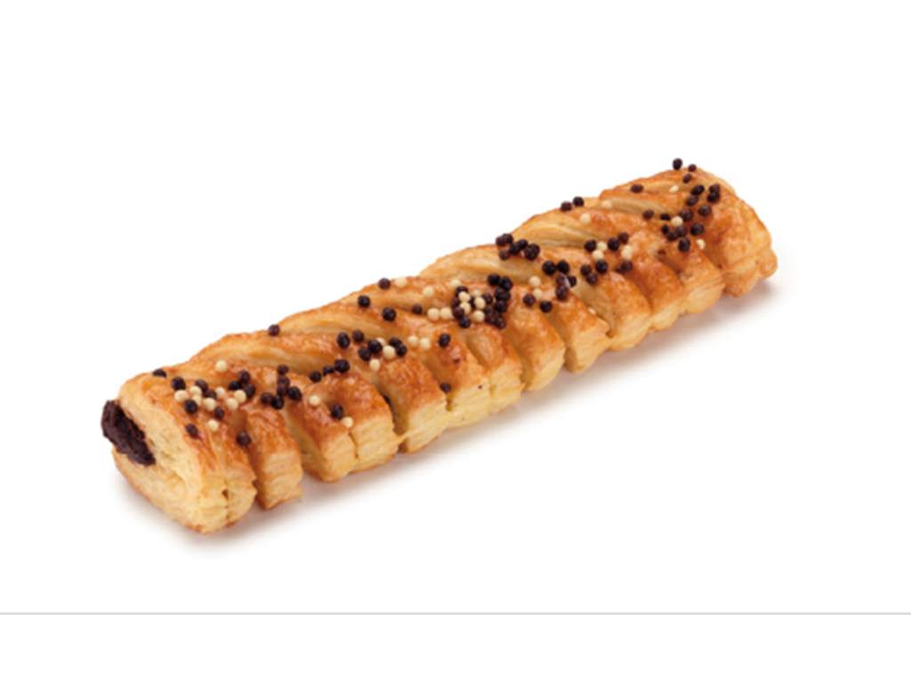 Folhado retangular dourado com pérolas de chocolate preto, branco e castanho sobre fundo branco.