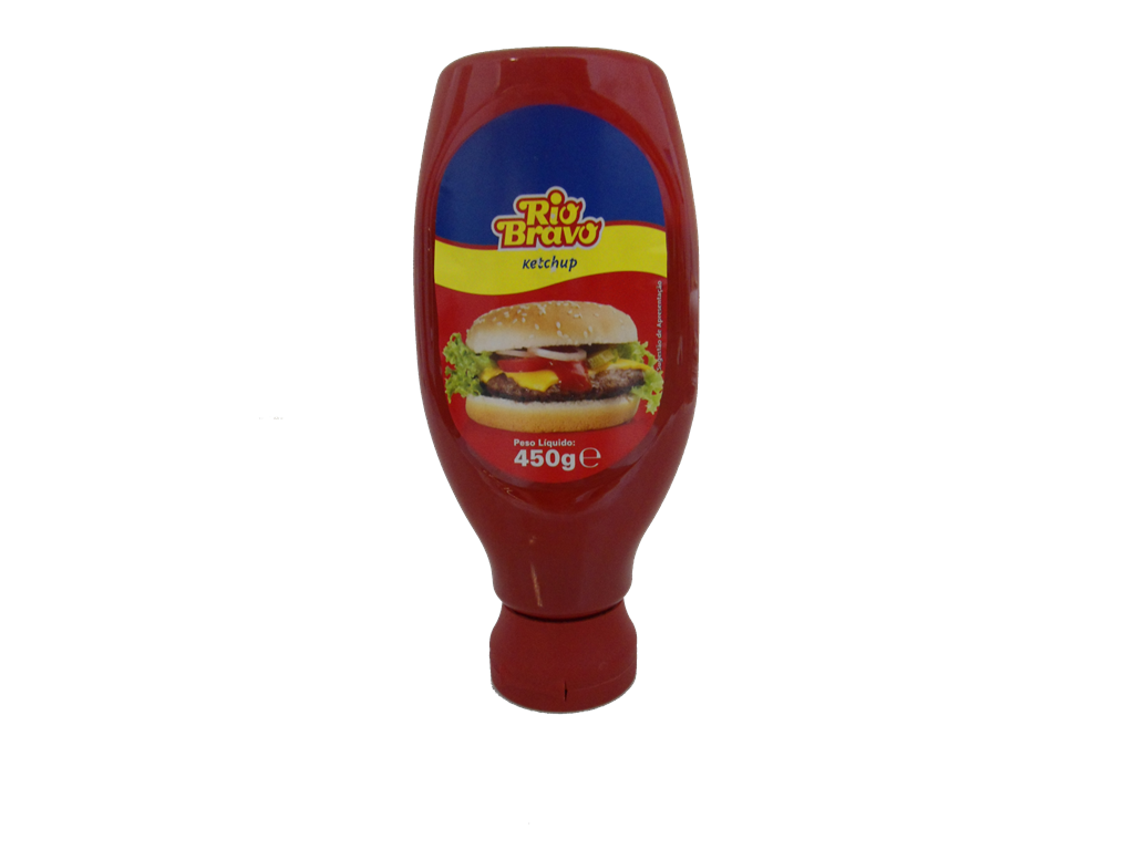 Frasco de ketchup Rio Bravo 450g com rótulo colorido e imagem de hambúrguer