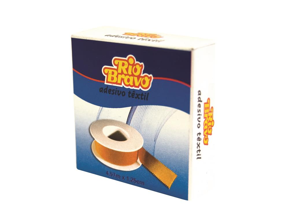 Embalagem azul e branca 'Rio Bravo adesivo têxtil' com rolo de fita adesiva castanha